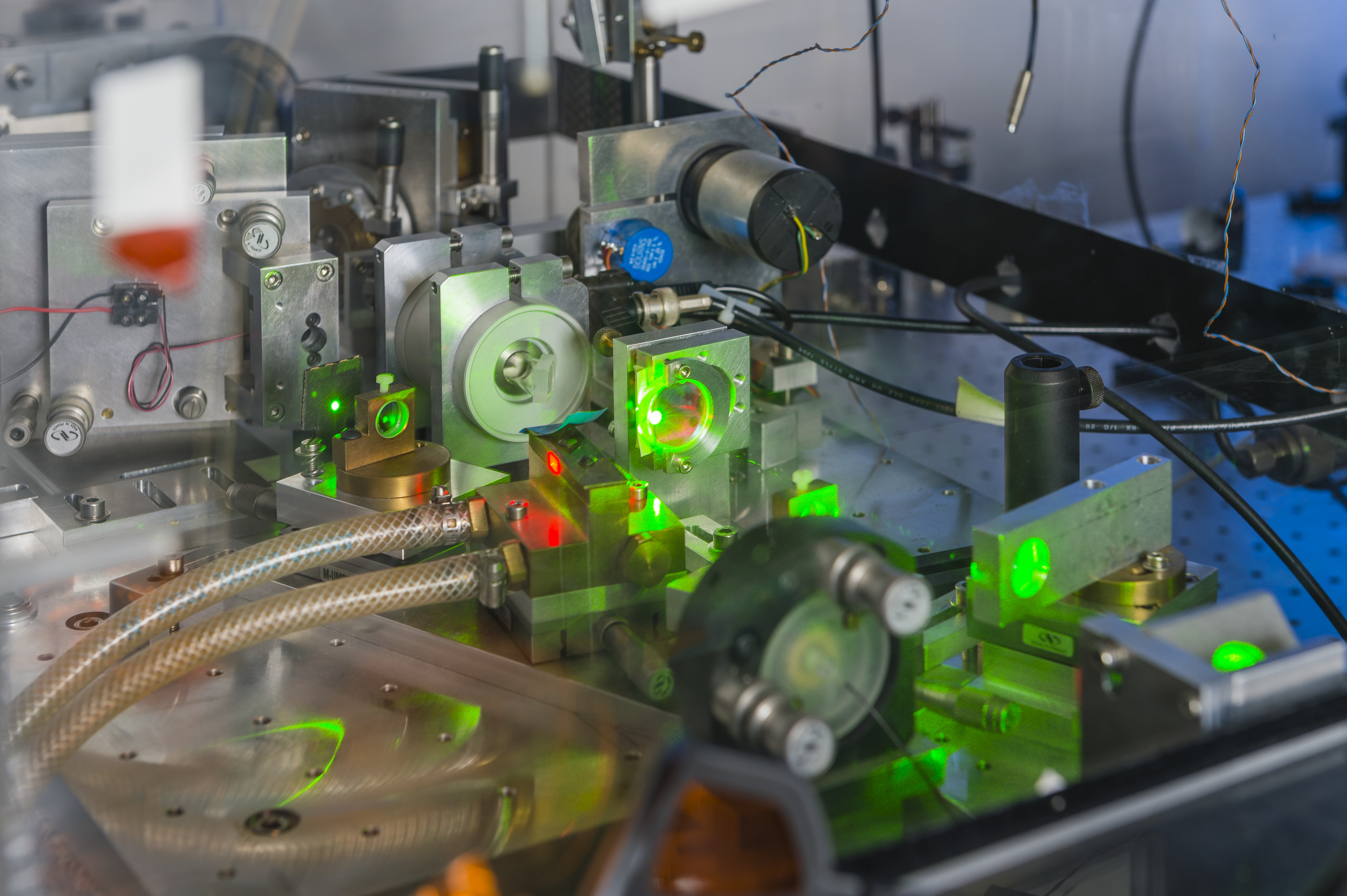 an ultra-narrow Ti:Sa laser (shown on the picture) tuned to the 729 nm clock